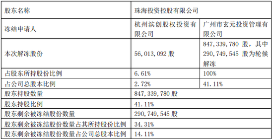 2020年7月28日,格力地产相关公告显示,控股股东海投公司被全部冻结的41.11%的公司股份中,已有杭州滨创股权投资有限公司与广州市玄元投资管理有限公司两家定增股东合计解除了6.61%的冻结股份, 剩余持有的34.31%股份仍处于冻结状态。