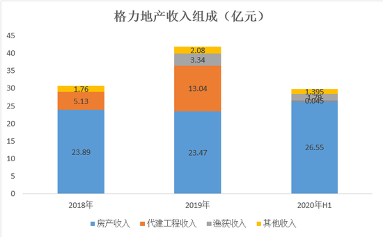 2020年上半年,格力地产房地产业务实现营收26.55亿元,占总体收入89.15%;包括渔获销售及其他业务板块营收合计3.23亿元,占比仅10.85%。由此可见,在收入端,并未脱离地产公司属性。