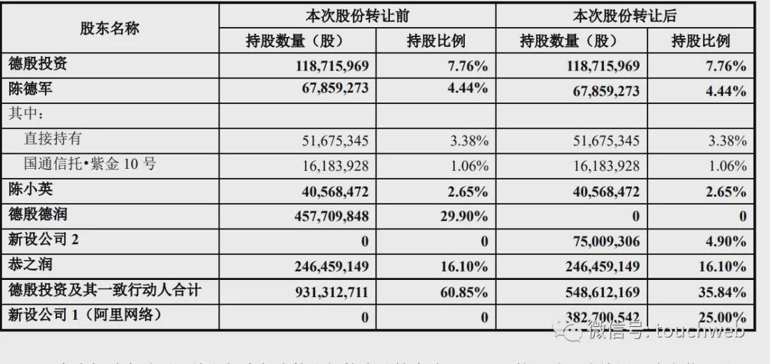 根据《股权转让协议》的约定,德殷投资拟向阿里网络转让其在德殷德润分立后将取得的新设公司1的41.40%股权,转让交易作价为3,295,192,511元。转让完成后,阿里网络将持有新设公司1的100%股权,新设公司1持有公司382,700,542股无限售流通股股份、占公司总股本的25%;