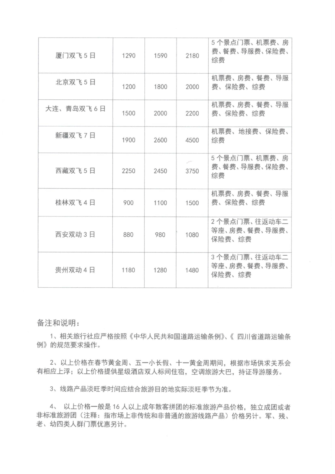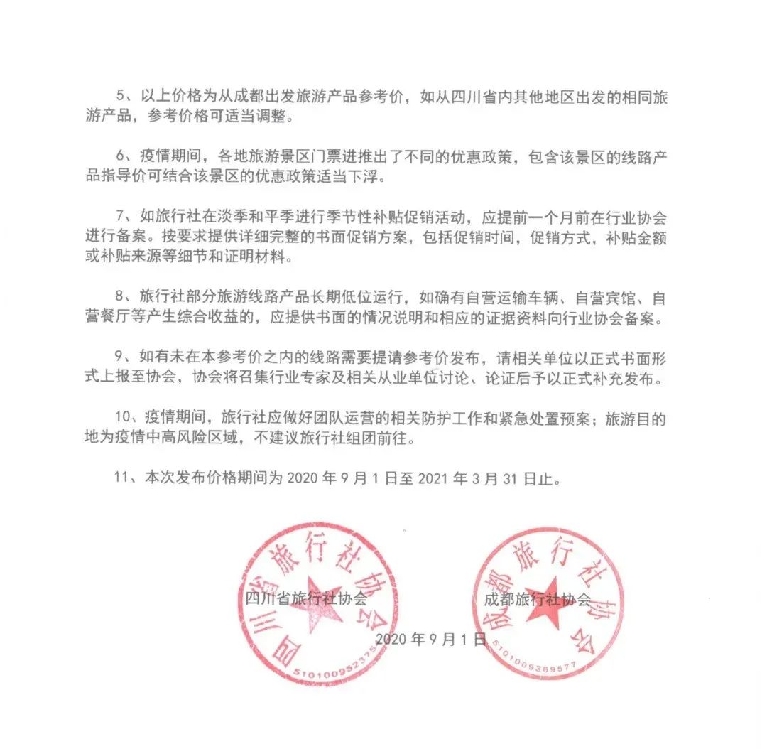此次公布的2020年四川旅游线路参考价一般是16人以上成年散客拼团的标准旅游产品价格,独立成团或者非标准旅游团价格另计,其出发地均为成都,如从四川省内其他地区出发的相同旅游产品,参考价格可适当调整。