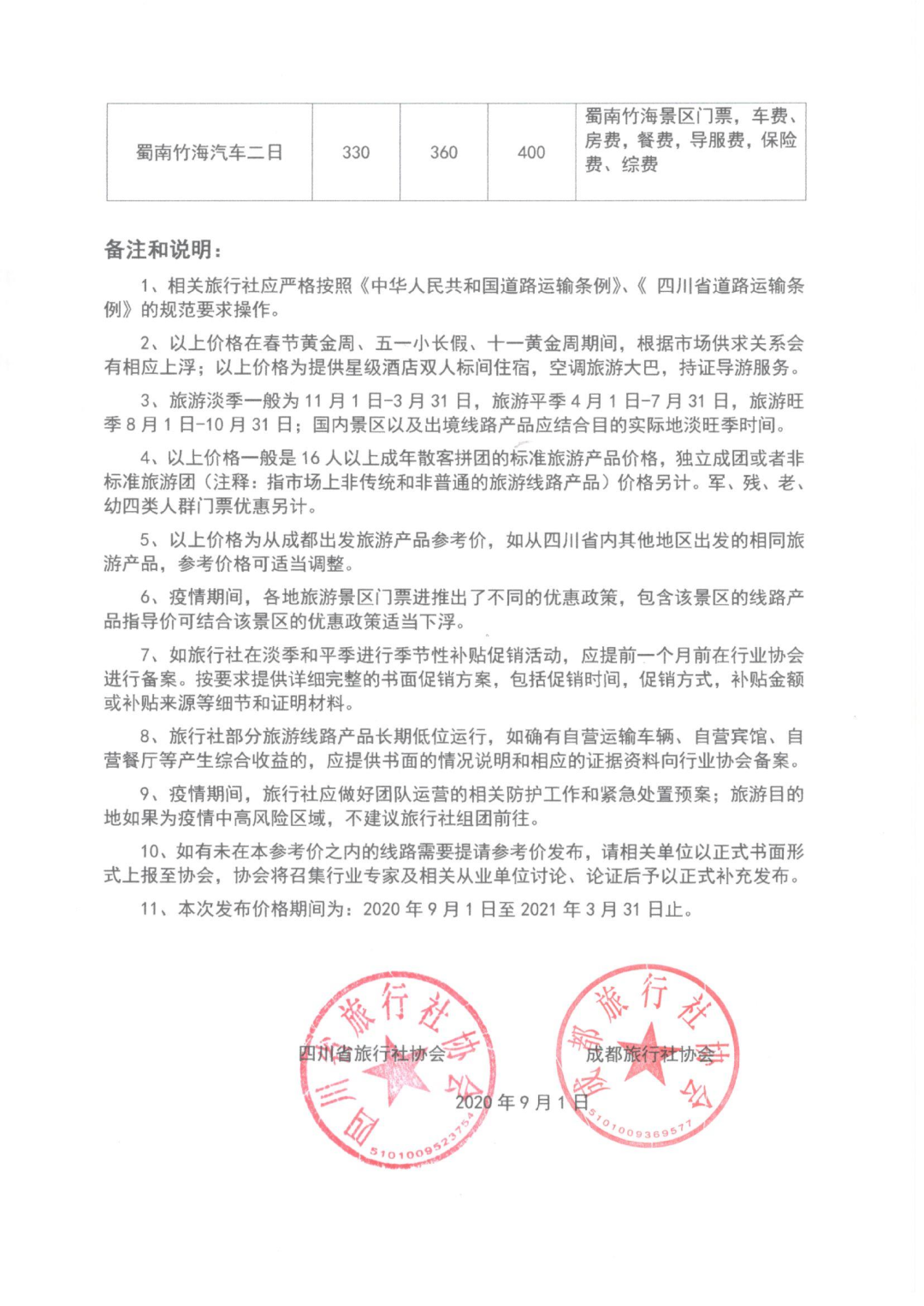 2020年四川旅游线路参考价的价格期间为2020年9月1日至2021年3月31日止。每条线路均有3个标价,分别为淡季价格、平季价格和旺季价格。其中,旅游淡季是在11月1日至3月31日,旅游平季是4月1日至7月31日,旅游旺季是8月1日至10月31日。