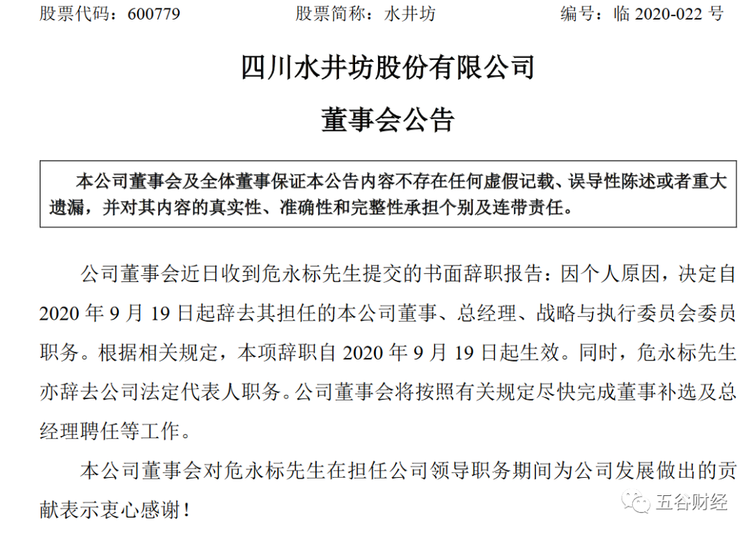 2020年9月18日晚间,水井坊发布公告,危永标因个人原因,决定自2020年9月19日起辞去其担任的本公司董事、总经理、战略与执行委员会委员职务。根据相关规定,本项辞职自2020年9月19日起生效。