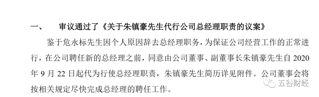 9月21日收盘之后,水井坊再次发布公告,鉴于危永标因个人原因辞去总经理职务,为保证公司经营工作的正常进行,在公司聘任新的总经理之前,同意由公司董事、副董事长朱镇豪自2020年9月22日起代为行使总经理职责。水井坊方面再次强调,董事会将按相关规定尽快完成总经理的聘任工作。
