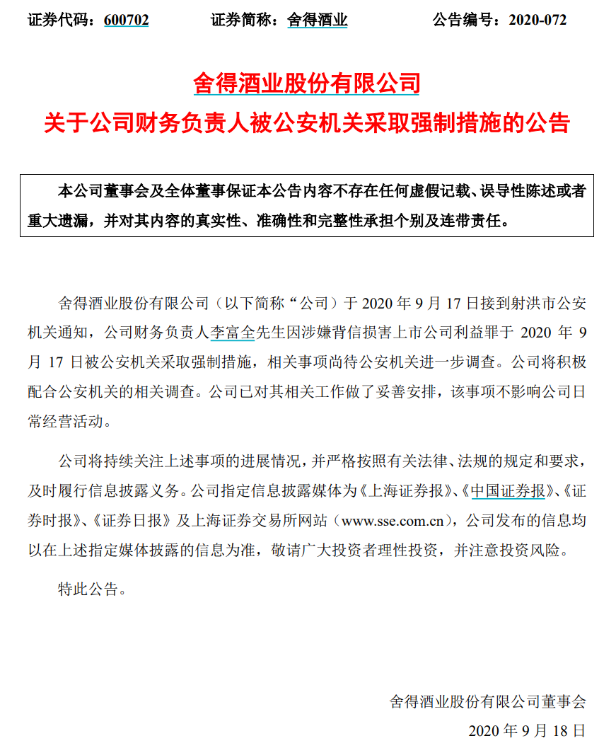9月17日晚间,舍得酒业公告称,公司接到四川省射洪市公安机关通知,李富全因涉嫌背信损害上市公司利益罪,在当日被公安机关采取强制措施,相关事项尚待公安机关进一步调查。