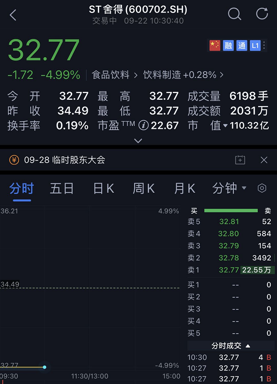 22日A股开盘,ST舍得戴帽后复牌跌停,报32.77元,跌停板上超22万封单。