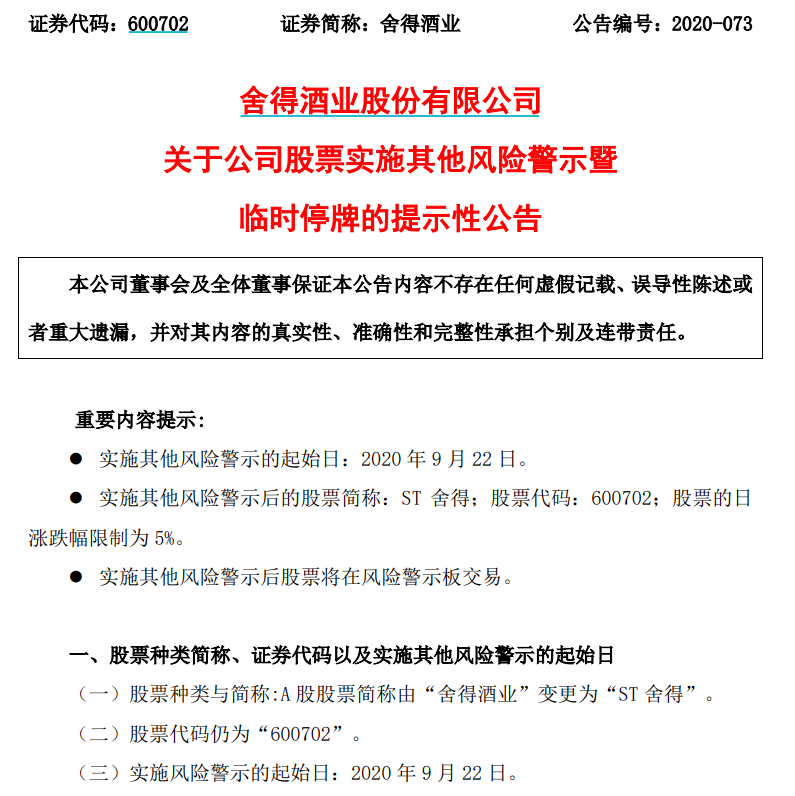 舍得酒业公告称,自9月22日起,该上市公司将被上交所实施其他风险警示,公司股票将于9月21日停牌一天,日涨跌幅限制为5%。股票简称由“舍得酒业”变更为“ST舍得”。