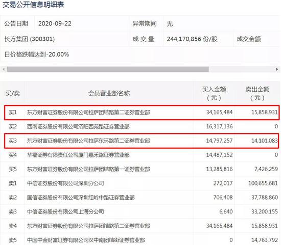 在长方集团今日公布的龙虎榜买方席位中,买一的东方财富证券拉萨团结路第二证券营业部买入3416万元,卖出1585万元;买三的东方财富证券拉萨东环路第二证券营业部买入1479万元,卖出1410万元。