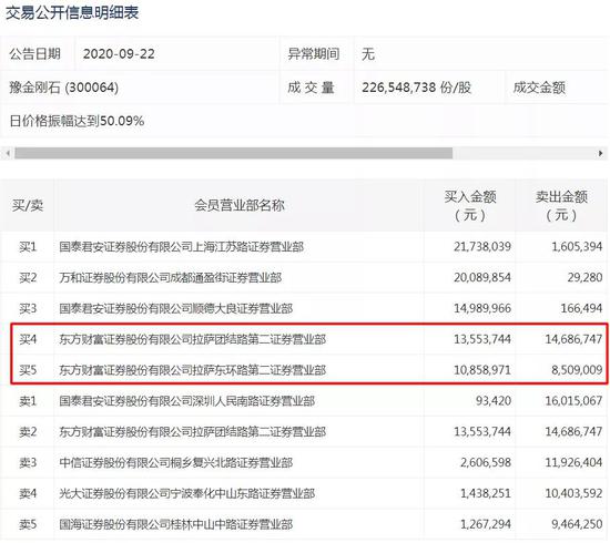 根据深交所数据,在豫金刚石今日公布的龙虎榜买方席位中,买四的东方财富证券拉萨团结路第二证券营业部买入1355万元,卖出1468万元。买五的东方财富证券拉萨东环路第二证券营业部买入1085万元,卖出850万元。