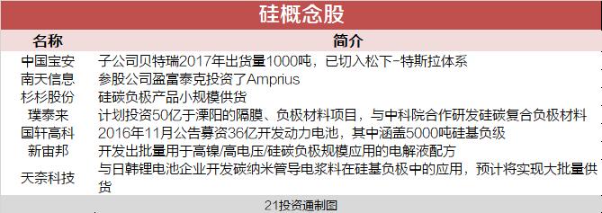 如中国宝安(000009.SZ)在新三板上市的子公司贝特瑞的硅碳负极较早实现产业化,是特斯拉核心供应商。南天信息参股的公司盈富泰克投资了创造这项新电池技术的Amprius。杉杉股份(600884.SH)等具备生产能力。
