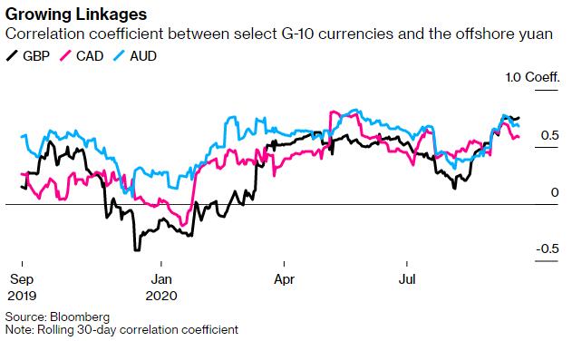 这是汇丰控股高级外汇策略师Dominic Bunning的观点。他表示,自疫情爆发以来,离岸人民币与许多G10货币之间的关联性有所增强。人民币对英镑以及澳元、纽元和加元等大宗商品货币每周汇率变化的影响已越来越大。