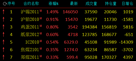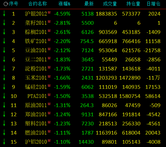 热点栏目9月23日,国内商品期市早盘多数品种下跌,沪银跌逾4%,纯碱盘中跳水一度跌至绿盘;油脂油料普跌,菜籽、棕榈油、豆油跌逾2%;能化品多数下跌,PTA、原油、塑料、燃油等跌逾1%;黑色系多数下跌,铁矿石跌逾2%;基本金属涨跌分化,沪锡涨逾1%,沪铅涨近1%,沪铝跌逾1%。