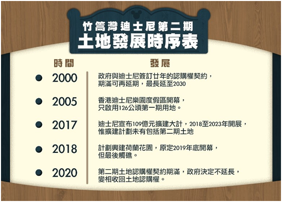 据香港“东网”报道,根据港府与香港国际主题乐园有限公司(即政府和迪士尼公司为股东的合营公司)在2000年签订的《认购权契约》,迪士尼获批认购权优先购买二期用地,以留作香港迪士尼乐园扩建之用。二期土地的认购权有效期为20年至今年,期满可再延期两次,每次5年,最长延至2030年。