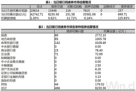 9月23日,全国银行间债券市场结算总量为42742.71亿元,较上日增长1.00%,交易结算总笔数为19614笔。其中,质押式回购33581.06亿元,买断式回购231.58亿元,现券交易8230.36亿元,债券借贷699.71亿元。银行间债券市场回购利率整体下行,其中,2天回购利率下行63.1bp至2.145%。