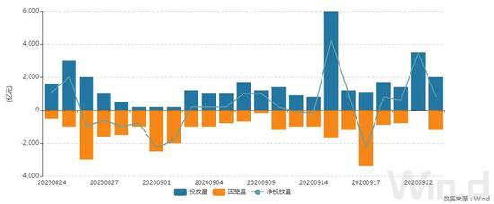 央行公告称,为维护季末流动性平稳,2020年9月23日人民银行以利率招标方式开展了2000亿元逆回购操作,包括1000亿元7天期和1000亿元14天期逆回购操作,中标利率分别为2.20%、2.35%。Wind数据显示,当日1200亿元逆回购到期,净投放800亿元。