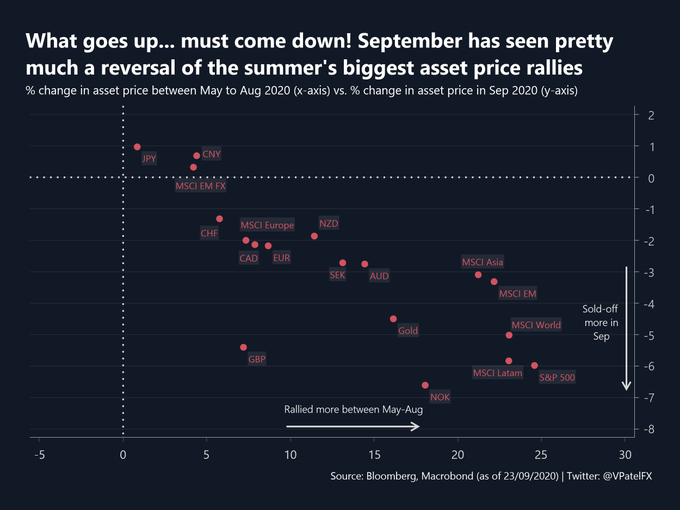 从下面这张对比图中,我们不难看到,那些曾在5月-8月间走势无比灿烂的资产,在9月几乎无一例外遭遇了滑铁卢。目前,也仅剩下日元、人民币等相对具有抵御力的货币,能够得保不失!