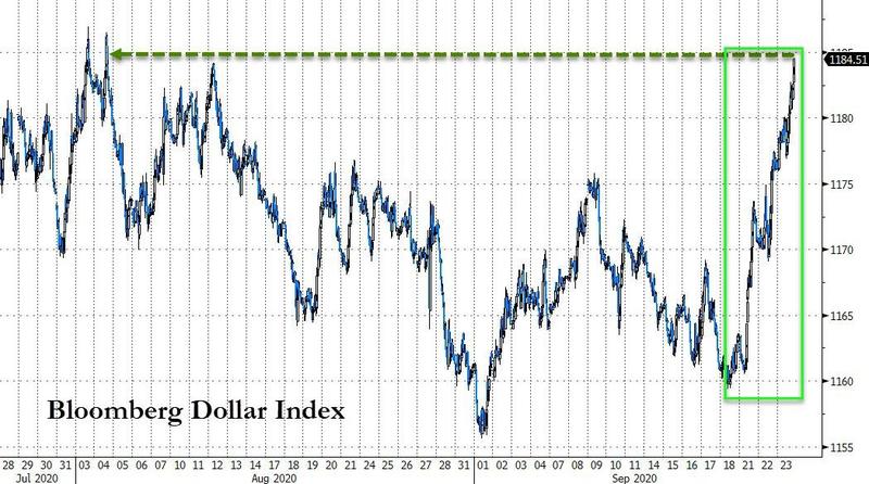 显然,在这风雨飘摇的9月尾声,全球市场正不断上演着资金大逃亡的戏码,而这一幕与今年三月市场暴跌时的景象何其相似。在华尔街交易员都深感山雨欲来的时刻,美元再度成为了市场急于渴求的避风港,越来越多的市场人士也开始重新拥抱现金。美元指数周三连续第四天上涨,进一步刷新八周高位。