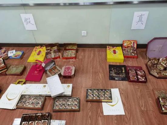 经侦总队食药环侦支队支队长喻檬介绍,犯罪嫌疑人李某等人为牟取非法利益,在未经权利公司授权许可的情况下,在福建设立制假窝点,购入面料、馅料等制作原料,雇佣当地村民加工生产成月饼后,使用购入的假冒知名品牌的包装材料进行包装,然后交由犯罪嫌疑人沈某等人销售给庄某、龚某等下级分销商。庄某等人在明知所购月饼系假冒品牌产品的情况下,仍以正品五到七成的价格通过社交软件和网络店铺销往全国多个省市。