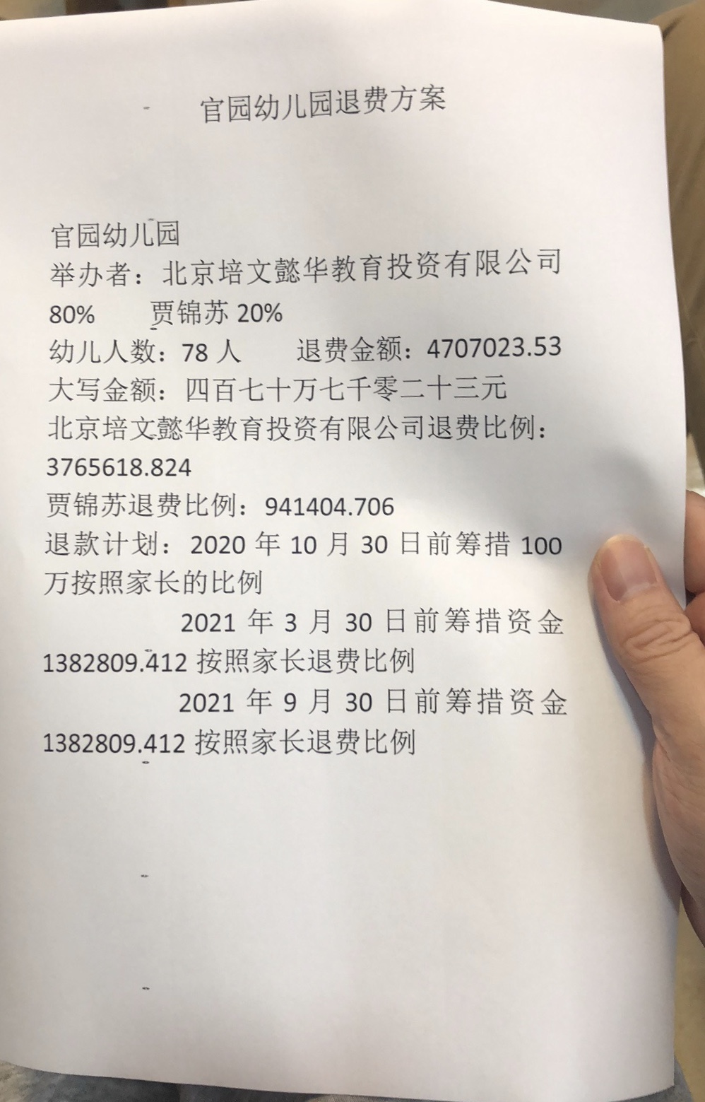 家长展示对方出具的退费方案。