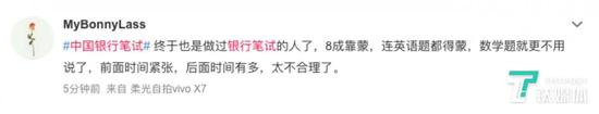 实际上,在微博上搜索“中国银行笔试”的相关话题时,抱怨本次中行笔试题目难的,远不止一位考生。名为“MyBonnyLass”的网友则表示:“8成靠蒙,连英语题都得蒙,数学题就更不用说了,前面时间紧张,后面时间有多,太不合理了。”