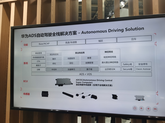 在车展上,华为还首次亮相了ADS(Autonomous Driving Solution,高阶自动驾驶全栈解决方案)。
