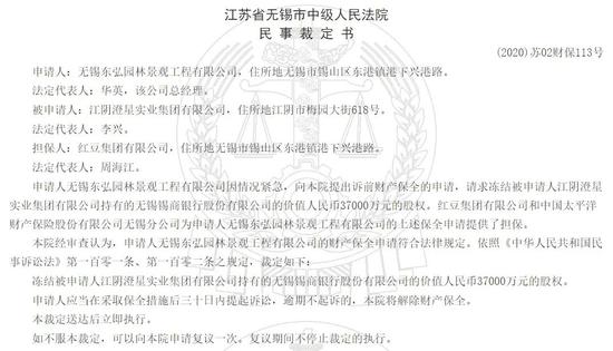 该民事裁定书显示,申请人无锡东弘园林景观工程有限公司因情况紧急,提出诉前财产保全的申请,请求冻结被申请人江阴澄星实业集团有限公司持有的无锡锡商银行股份有限公司的价值人民币37000万元的股权,冻结期限自2020年6月30日至2023年6月29日。