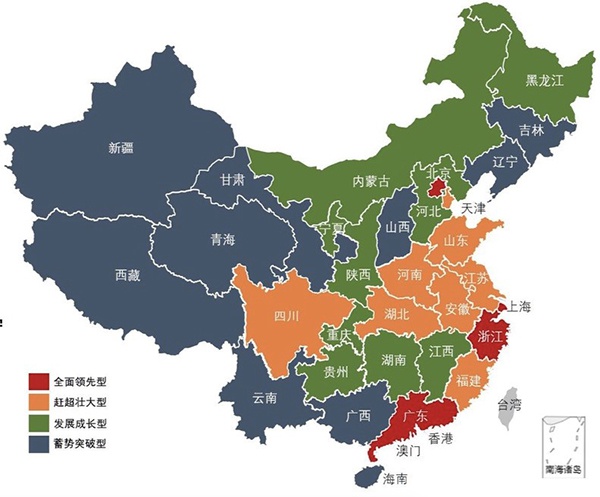 从总指数来看,北京、上海、浙江、广东属于全面领先型,天津、江苏、安徽、福建、山东、河南、湖北、四川属于赶超壮大型,贵州、陕西、湖南、江西、黑龙江、内蒙古、重庆、宁夏、河北属于发展成长型,山西、辽宁、吉林、广西、海南、云南、西藏、甘肃、青海、新疆属于蓄势突破型。全面领先型和赶超壮大型省份的均值高于全国的均值,发展成长型和蓄势突破型省份的均值低于全国均值。