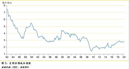 美国是一个服务业为主的经济体,服务业占GDP的比重接近70%。在居民消费支出中,大约60%是服务性开支,仅有40%为商品性开支。这些都大致反映在消费物价(CPI)及PCE等通胀指标上。对服务性消费而言,决定其价格的除了短期市场供需状况之外,最主要的就是劳动力成本。而受到产业外移等因素的压制,美国的劳动力成本在过去25年里一直呈温和增长,而且有逐级回落的态势(见图3)。显然,美联储的宽松货币政策并没带来高通胀,甚至很少触及其2%的通胀上限目标。美国通胀在过去25年长期低位徘徊,很可能源于以下三方面原因。