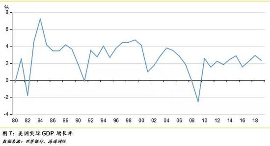 然而,回顾历史,美联储的近零利率和量化宽松政策在过去10多年里并没有给美国经济带来强劲的、可持续的增长。2010—2019年的十年里,美国年均实际GDP增长率仅为2.3%,明显低于之前30年(1980—2009年)2.8%的年均增长率。即便在过去10年内增长最强劲的2018年,经济增长率也只有2.9%(见图7)。