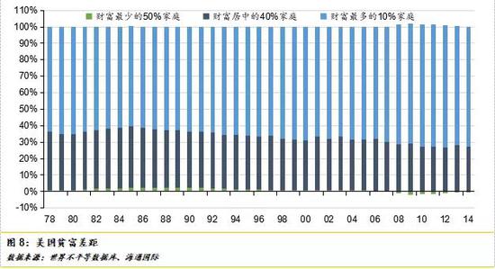 美联储的宽松货币政策之所以未能带来经济的强劲和可持续增长,也源于和低通胀相类似的结构性原因。如劳动者薪酬上升乏力制约了美国家庭收入的改善,不利于消费的可持续增长;同时,低利率鼓励企业增加资本开支、用技术设备来替代劳动力,也导致收入分配更倾向于资本,加大了收入的差距,导致美国贫富差距不断扩大,甚至到了畸形的状态。根据“世界不平等数据库”的估测,美国最贫穷的50%的家庭的净资产增长,在过去40年几乎为零,且在金融海啸之后竟连续多年出现负值(见图8)。由于低收入群体边际消费倾向更高,贫富差距的扩大显然不利于美国居民消费的增长。鉴于私人消费占美国经济的70%,消费增长的后劲不足制约了美国经济的可持续增长。这可能是美联储实施宽松货币政策始料未及的另一项“副作用”。
