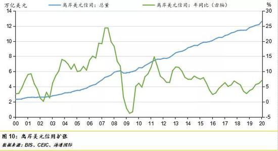 美联储的宽松货币政策往往会产生巨大的“溢出效应”,导致全球美元流动性泛滥。以金融海啸之后的三轮量化宽松政策为例,在2009—2014年的6年间,美联储的资产负债表扩大了约3.6万亿美元,其中大约2.6万亿美元流向了可创造信贷的商业银行准备金。但这些准备金所创造的国内信贷却非常有限。相反,大量美元流到海外市场以寻求更高收益。根据国际清算银行(BIS)的数据,2009—2014年,全球离岸美元信用从5.8万亿增长至9.4万亿美元(见图10),涨幅达62%,远高于美国国内M2同期43%的涨幅(8.2万亿至11.7万亿美元)。
