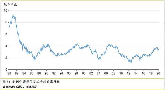 此外,与中国、墨西哥、越南等发展中经济体相比,美国雇佣成本要高得多,在国际竞争中处于劣势。随着全球化的加速,大量美国制造业企业都选择在海外建厂,以节约成本。许多企业不得不关闭在美国的工厂,令工作机会不断减少。即便在服务业领域,为降低雇佣成本,一些美国企业也将一部分服务类工作(如客户服务、翻译、药品测试、编程等)外包到发展中国家,从而减少了美国本土的就业机会。由于缺乏专业技能,这些失业人群在寻找新工作时缺乏讨价还价的能力,除非美国经济强劲增长并导致劳动力市场非常紧张,否则其薪酬很难出现较大上涨(见图4)。