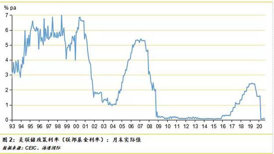 在过去25年里,美联储曾屡次推出激进的宽松货币政策。如在2000年网络泡沫破裂及2001年“9·11”事件之后,美联储曾在一年内连续11次减息,将政策基准利率从6.50%下调到1.75%,之后又在2002年和2003年两次下调,最低达到1%的水平(见图2);2007年“次贷危机”发生后,美联储在不到1年半的时间里连续10次下调基准利率,最终逼近零利率,并维持7年之久,还史无前例地推出三轮“量化宽松”政策。今年,在新冠肺炎疫情剧烈冲击全球金融市场的背景下,美联储不但迅速恢复至近零利率,更是推出了“无限量宽”政策。