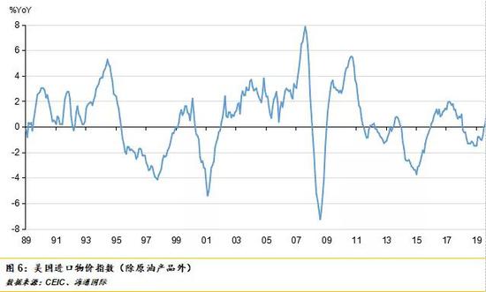 在美国消费者的商品性开支中,有相当多是进口产品。1995年以来,美国进口物价指数(原油产品除外)年均涨幅仅有0.36%(见图6);而2009年以来,这一涨幅几乎为零(-0.02%)。换句话说,过去25年里,除个别年份外,美国通过进口海外产品大幅度拉低了国内的通胀水平。