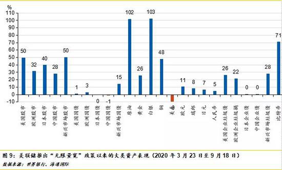 值得关注的是,在今年3月美联储推出“无限量宽”政策之后,全球各类资产价格(股票、信用、商品、黄金、甚至比特币等)都出现了大幅度上涨(见图9)。美国三大股指的估值也接近历史高点,与美国实体经济受新冠疫情影响而出现深度衰退的现实形成鲜明对比。显然,资产价格的这种上涨是不可持续的。一旦形势逆转,全球金融市场很可能再次面临巨大的波动。