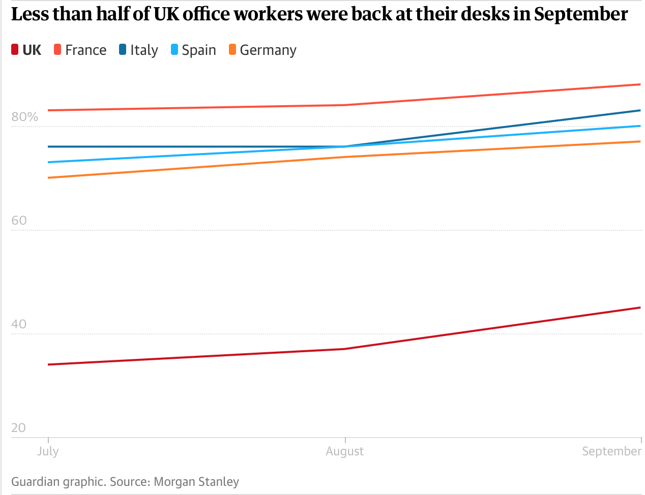 九月,复工的英国人不超50%,远远低于其他欧洲大国。数据来源:摩根士丹利/《卫报》
