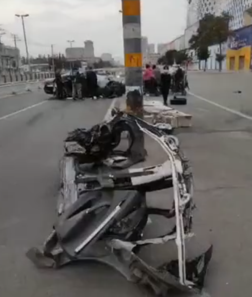 同时车辆的发动机舱也遭受到了损毁,发动机也已接近脱落在车外。从事故现场视频来看,该车遭受了严重的撞击,整车也面临着报废的局面。