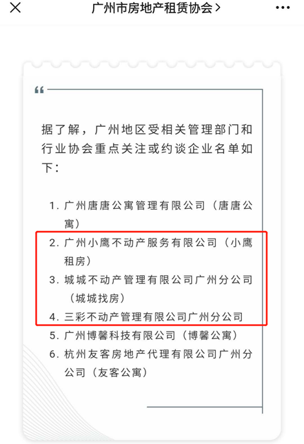 9月1日,广州市房地产租赁协会发出风险警示,提醒广大住房租赁当事人在租赁活动中谨慎选择、注意甄别,并公示了已被相关管理部门和行业协会重点关注及约谈的企业名单,其中广州小鹰租房、城城找房广州分公司、三彩家广州分公司均在列。