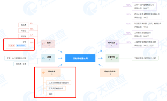 根据天眼查企业结构图信息,三彩家与城城找房背后曾有过相同的股东或实投人,而三彩家的招股说明书中也写明城城找房曾是三彩家的关联方。