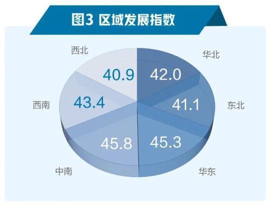 从六大区域指数(见图3)来看,呈现“五升一平”态势。华北地区小微指数为42.0,上升0.2个点;东北地区为41.1,上升0.3个点;华东地区为45.3,上升0.2个点;中南地区为45.8,上升0.2个点;西南地区为43.4,与上月持平;西北地区为40.9,上升0.1个点。