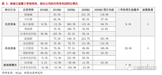 就新能源的三季报而言,光伏设备、风电设备、新能源整车的的披露率分别为9.4%、28.6%、8.3%。结合已披露数据,整体而言,光伏设备的三季度盈利延续了高增长态势,4家公司净利润增速较中报收窄,但也保持了高速增长;风电设备的三季度盈利保持高速增长,且4家公司的盈利增速较中报均进一步扩大;新能源整车的比亚迪,三季度净利同比较前期明显改善,达84.2%。