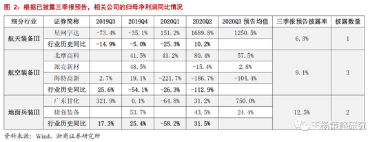 针对三季报预告,航天装备、航空装备、地面兵装的披露率分别为6.3%、9.1%、12.5%。根据已披露情况,航天装备中的星网宇达、航空装备中的北摩高科、地面兵装中的广东甘化和捷强装备等净利增速,较中报收窄,但保持了高速增长,而派克新材、海特高新相较于中报有所改善。