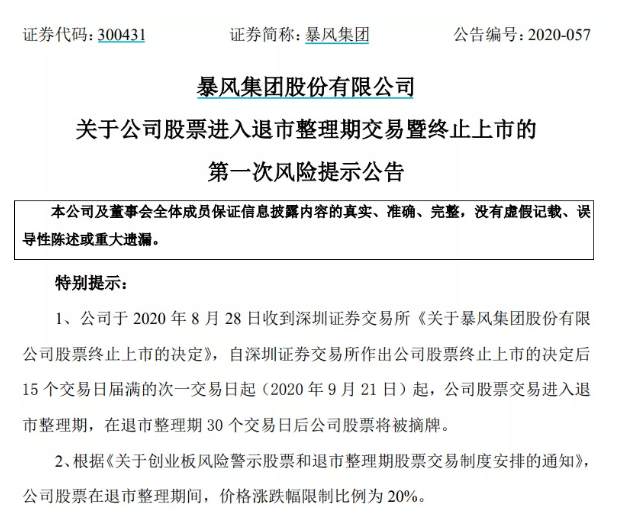 图片来源:微博今年9月21日起,暴风集团进入退市整理期,在退市整理期30个交易日后公司股票将被摘牌。股票简称更改为“暴风退”。