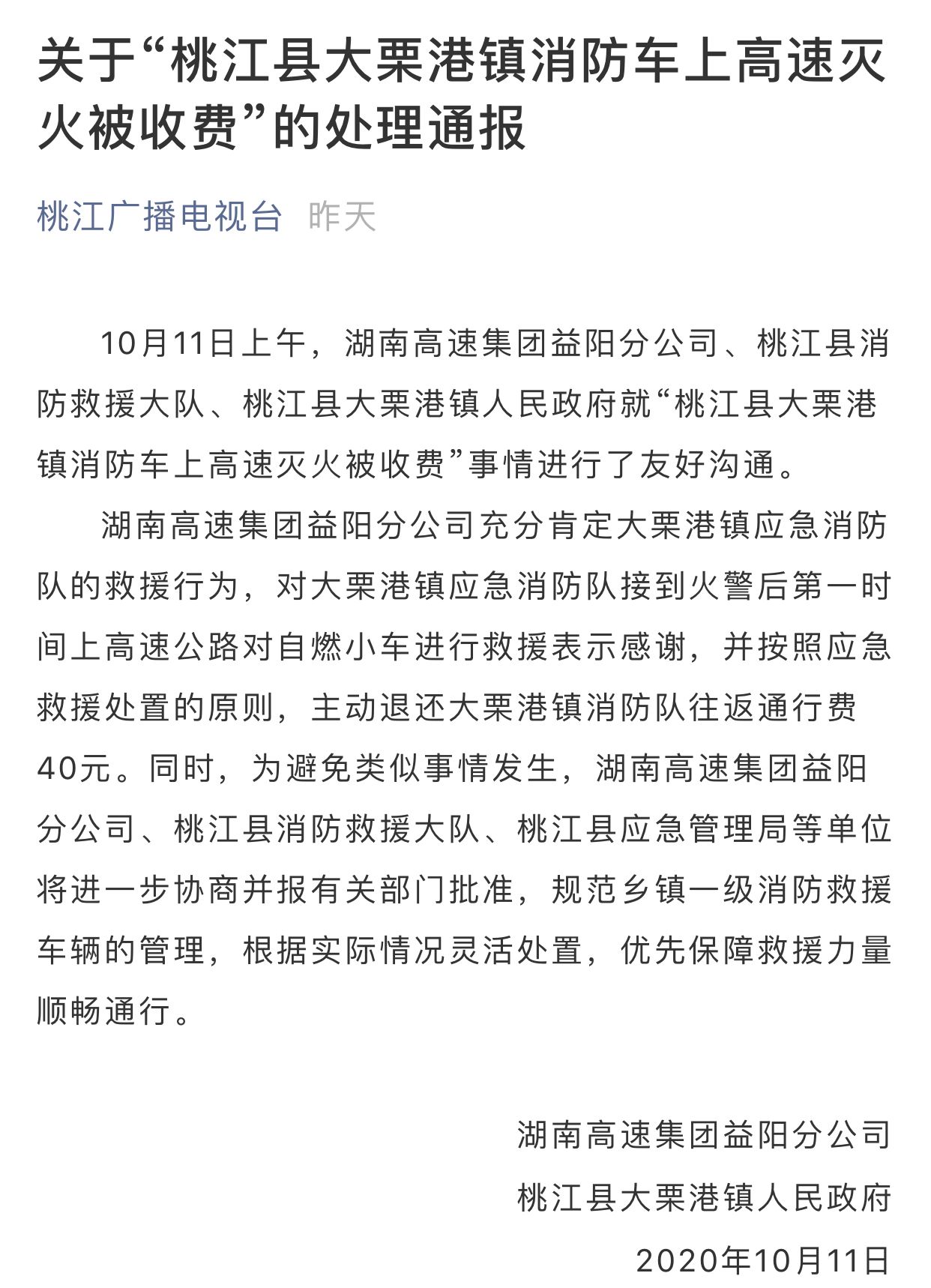 视频中,湖南益阳桃江县一名行政执法大队负责人说消防车是去救火的,消防车拉着警报准备出去的时候被高速公路收费站的工作人员要求收费,湖南高速集团益阳分公司的工作人员则解释说,“参与灭火的情况属实,但是不能提供免费的依据,所以他们也没有这个权利。”该收费站一共收取了消防车一来一回共40元通行费。