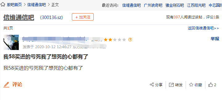 也有高位买进的网友哭诉称:“我58买进的,亏死我了,想死的心都有了”,还有投资者表示“捡了一些信维通信”。