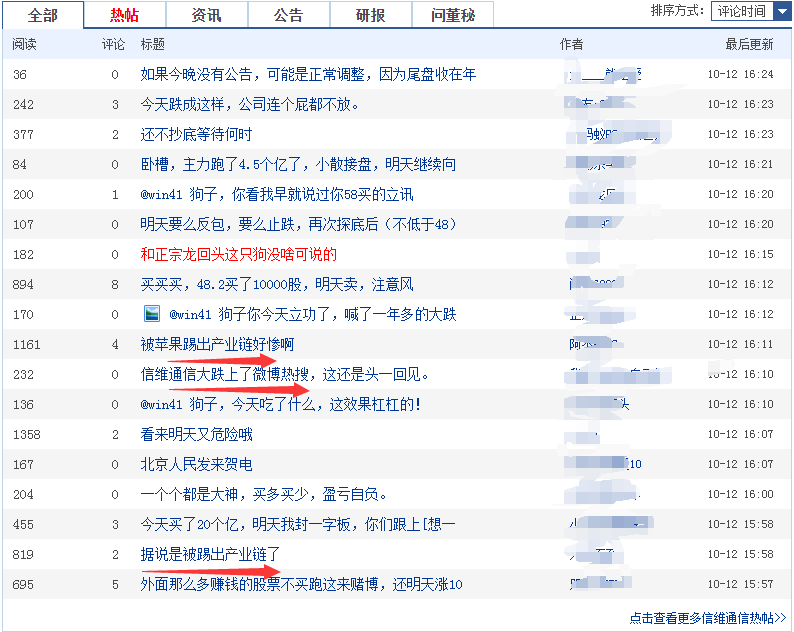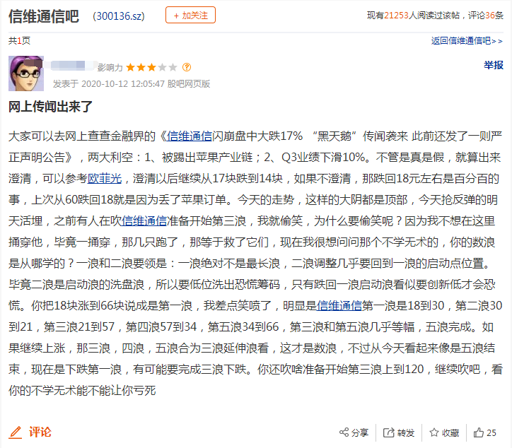 然而,上述利好加持以及今日盘面普涨的情况下,缘何还是暴跌?究竟发生了什么?股吧有网友发文称:“信维通信两大利空:1、被踢出苹果产业链;2、Q3业绩下滑10%。”,目前该贴文被标注为热门,高达22009人阅读,30多人回复。