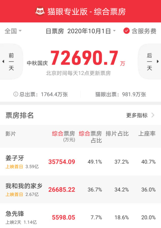 猫眼专业版数据显示,今年国庆长假首日总票房为7.27亿元,相较2019年的8.15亿元,已恢复了近九成。其中《姜子牙》以3.58亿元高居首位,并刷新了由《哪吒之魔童降世》保持的中国影视动画电影首日票房纪录。《我和我的家乡》《急先锋》则分别以2.67亿元和5598万元分列当日票房的二三名。