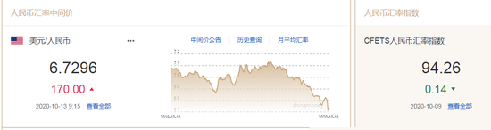 热点栏目10月13日,人民币中间价报6.7296,下调170点,上一交易日中间价报6.7126,在岸人民币上一交易日收报6.7358。