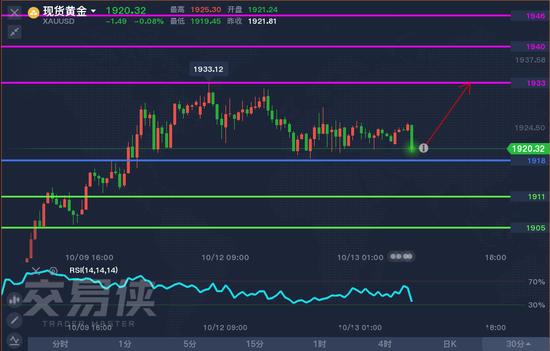 现货黄金日内在1918附近形成了一个支撑的底部,可维持金价短期走势稳定。日内关注转折点1918,在1918之上,看涨,目标价位为1933,然后为1940。若运行至转折点1918下方,则可考虑备选看空策略,留意支撑位1911,然后为1905。