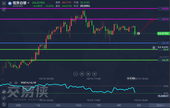 现货白银日内RSI技术指标看涨。日内关注转折点24.75,在24.75之上看涨,目标价位为25.31,然后为25.56;若运行在24.75之下,则可考虑备选看空策略,留意目标价位24.60,然后为24.35。