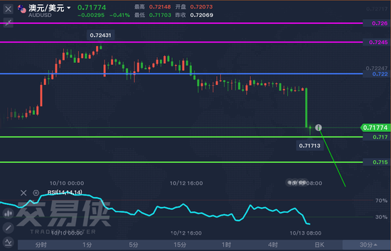 澳元/美元日内RSI技术指标跌破其30位置。关注转折点0.7220,若运行在0.7220之下看跌,目标价位为0.7170,然后为0.7150。若运行在0.7220之上,则可考虑备选看涨策略,目标价位定在0.7245,然后为0.7260。